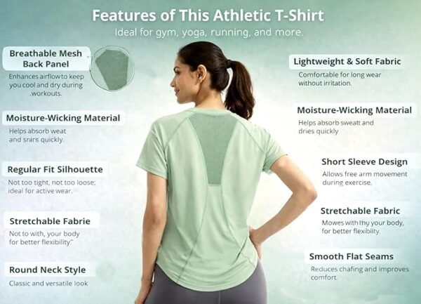 This Women’s Athletic T-Shirt Is Designed To Keep You Comfortable And Cool During Your Most Intense Workouts. Featuring A Stylish Colour Options, This Short-Sleeve Workout Top Combines Functionality With A Flattering Fit That Moves With Your Body. The Standout Feature Is The Breathable Mesh Back Panel, Strategically Placed To Enhance Ventilation And Help Regulate Your Body Temperature When You’re Pushing Your Limits. Whether You’re Hitting The Gym, Going For A Run, Or Attending Your Favourite Fitness Class, This Versatile Athletic Top Delivers The Performance You Need. The Crew Neck Design Offers A Classic, Comfortable Fit, Whilst The Lightweight Fabric Wicks Away Moisture To Keep You Feeling Fresh Throughout Your Exercise Routine. The Thoughtful Construction Ensures Unrestricted Movement, Making It Perfect For Yoga, Cardio, Strength Training, Or Any Active Pursuit. This Workout T-Shirt Seamlessly Transitions From Your Training Session To Casual Wear, Offering Both Style And Practicality. The Soft Fabric Feels Gentle Against Your Skin, Reducing Irritation During High-Intensity Activities. Add This Essential Piece To Your Activewear Collection And Experience The Perfect Blend Of Comfort, Breathability, And Performance That Will Support Your Fitness Journey.