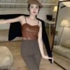 Elevate your style with this trendy Leather Crop Top Bra, designed for bold and confident women. Crafted with premium faux leather, this chic crop top features a sleek body-hugging fit and thin adjustable spaghetti straps for a modern look. Perfect to pair with high-waist jeans, skirts, or layered under jackets, it adds a touch of edgy sophistication to your casual or party wear. The soft lining ensures comfort while maintaining its stylish appeal, making it an essential statement piece for your wardrobe.