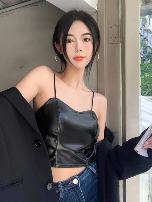 Fashiol Women’s Leather Crop Top Bra with Spaghetti Straps – Stylish Partywear Sleeveless Bustier